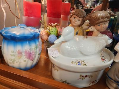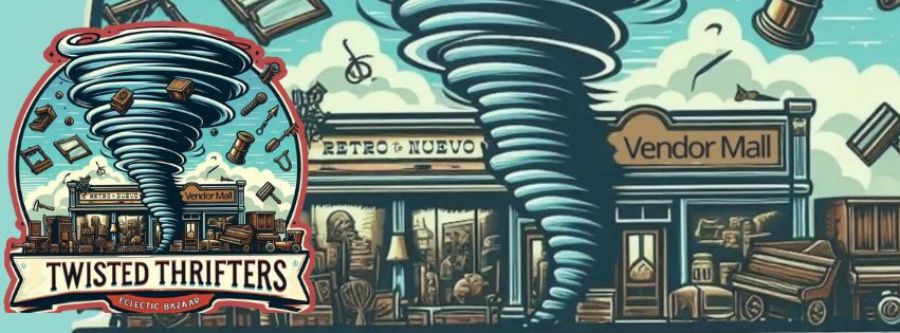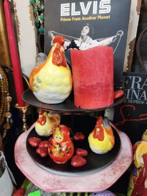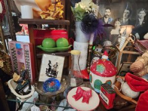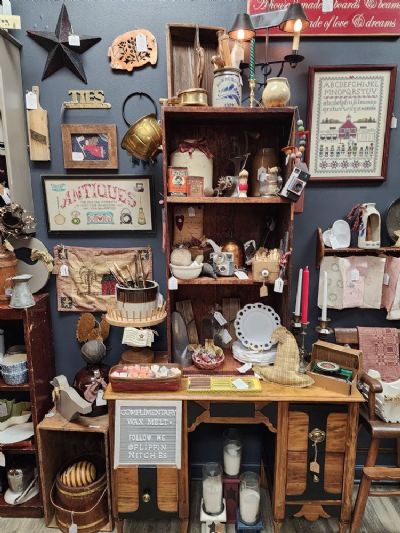 This electic bazaar shop features multiple booths with curated treasures, including vintage items, MCM lamps, local art, vintage jewelry, granny chic